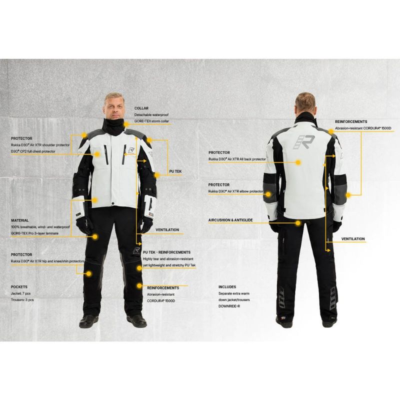 Chaqueta de moto Rukka Touring para hombre. Neopreno suave en el cuello. Puños con cremalleras y puños interiores impermeables GORE-TEX. Cuello impermeable desmontable antitormentas en material GORE-TEX Stretch. Incluye una chaqueta de plumón extra cálida independiente con relleno de 135 g (90 % plumón, 10 % pluma), fácil de guardar en su propia bolsa pequeña. Ajuste de ancho en la parte superior e inferior del brazo con broches a presión. Dobladillo y puños ajustables con velcro. Correa de entrepierna y cremallera larga de conexión para pantalones. Refuerzos de CORDURA® 1500D resistentes a la abrasión en hombros y codos. Tecnología de rendimiento GORE-TEX 100 % transpirable, cortavientos e impermeable: laminado de 3 capas con una capa exterior de poliamida elástica ligera, resistente a la abrasión y al desgarro. Refuerzos de PU Tek altamente resistentes al desgarro y a la abrasión, pero ligeros y elásticos en hombros y codos. Dos bolsillos inferiores resistentes al agua con cremallera. Dos bolsillos interiores resistentes al agua, incluyendo un bolsillo para el móvil. Un bolsillo para tarjetas con cremallera en el extremo de la manga izquierda. Dos bolsillos en chaqueta interior desmontable.