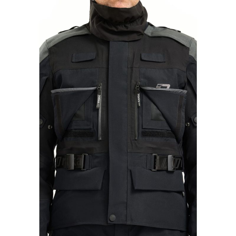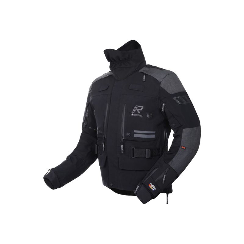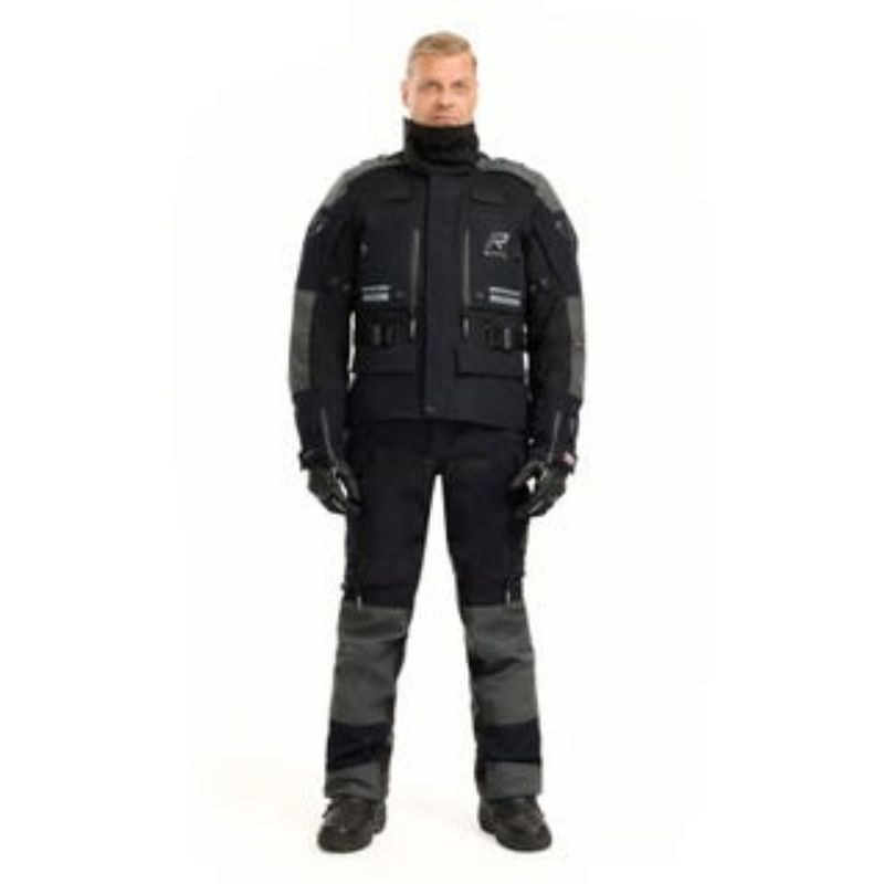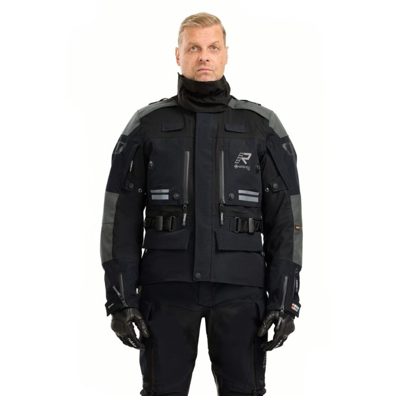 Chaqueta de moto Rukka Adventure para hombre. Neopreno suave en el cuello. Puños con cremalleras y puños interiores impermeables de GORE-TEX. Paneles elásticos en el pecho, axilas y espalda. Correas en los hombros y presillas elásticas en la espalda para la instalación de una bolsa de agua. Cuello impermeable desmontable en tejido GORE-TEX Stretch. Cierres magnéticos FIDLOCK® en el pecho, fáciles de abrir con una mano. Ajuste de ancho en la parte superior del brazo con broches a presión. Dobladillo y puños ajustables con velcro. Cinturón ajustable. Correa en la entrepierna y cremallera larga de conexión para pantalones. Tejido exterior 100 % transpirable, cortavientos e impermeable de GORE-TEX Pro de 3 capas laminado sobre CORDURA® resistente a la abrasión y al desgarro. Refuerzos de CORDURA® 1500D resistentes a la abrasión en hombros y codos. Bolsillo grande en la parte baja de la espalda compatible con una bolsa de agua de 1,5 L. Bolsillo interior impermeable para documentos. Dos bolsillos inferiores impermeables con cremalleras y velcro.