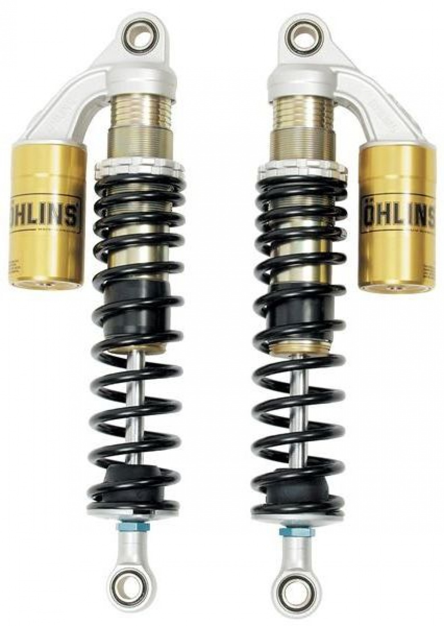Pareja de amortiguadores Öhlins con muelles en negro. Precarga del muelle con contratuerca y longitud +/- 10mm de distancia entre ejes variable. El precio indicado es por la pareja de amortiguadores.