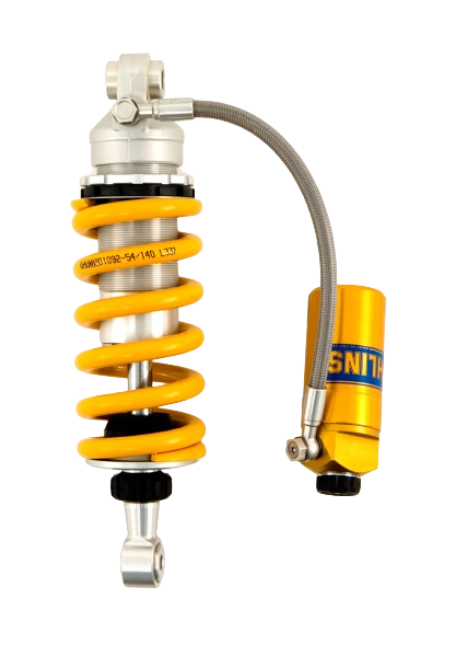Amortiguador Öhlins S46HRC Monotubo 46 mm, presurizado con depósito de nitrógeno, con tubo separado, eje de 16 mm y ajustable en compresión y rebote.