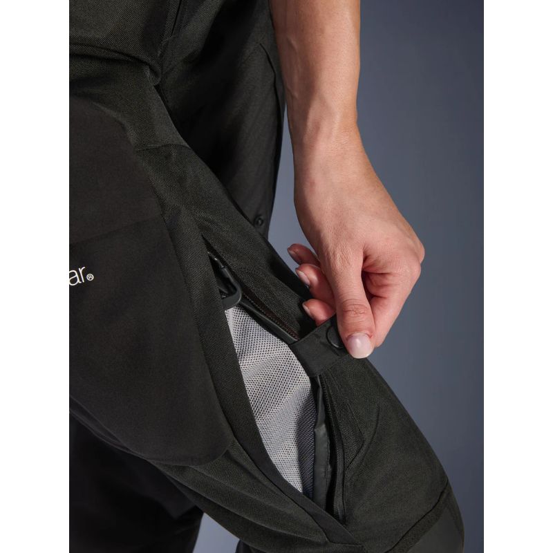 • Cremalleras impermeables en las aberturas de ventilación de los muslos aseguran un cierre seguro y una gestión efectiva del flujo de aire.